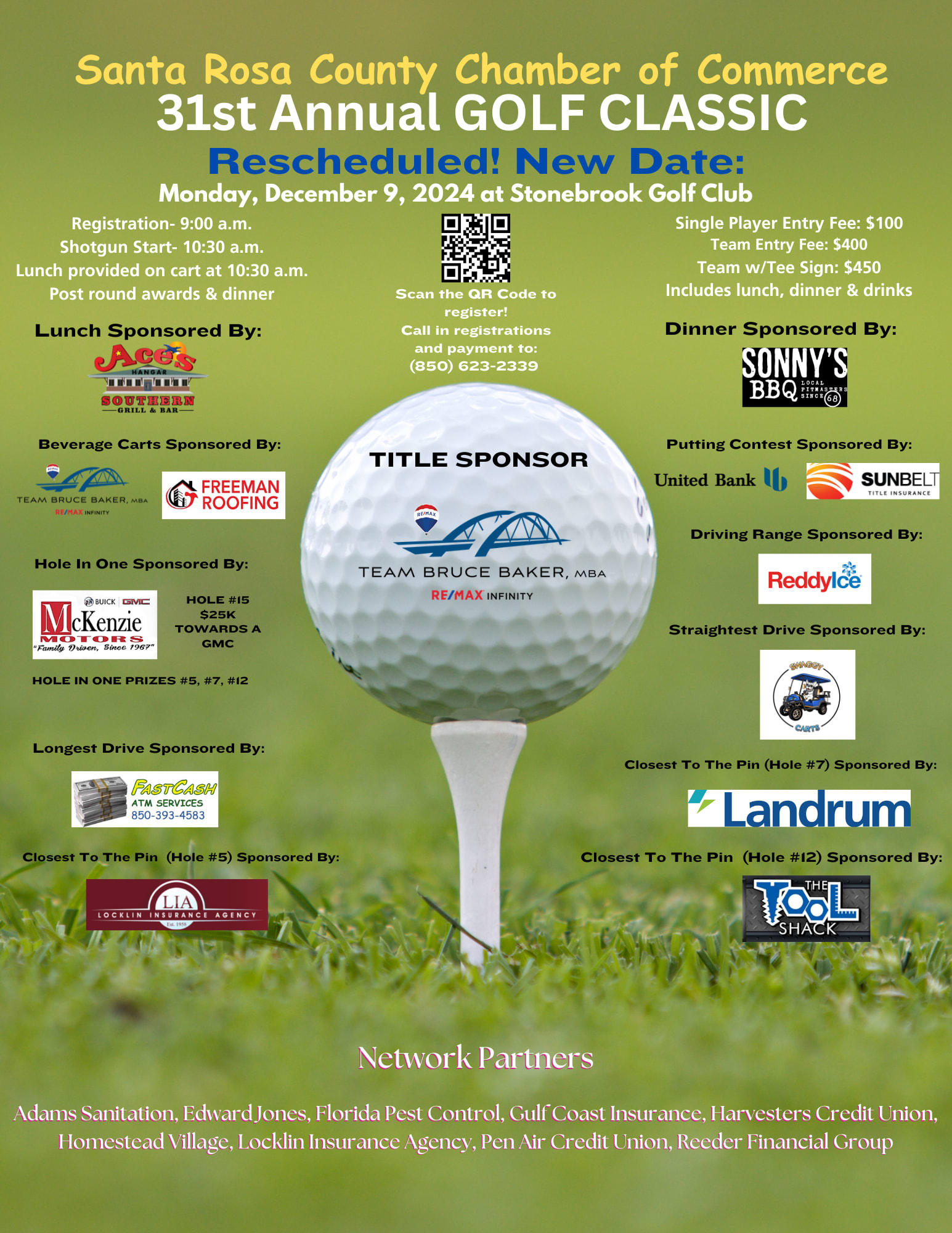 Registration begins 9 a.m. Shotgun start at 10:30. Boxed lunch provided by Ace's Hangar; after rounds dinner by Sonny's BBQ.