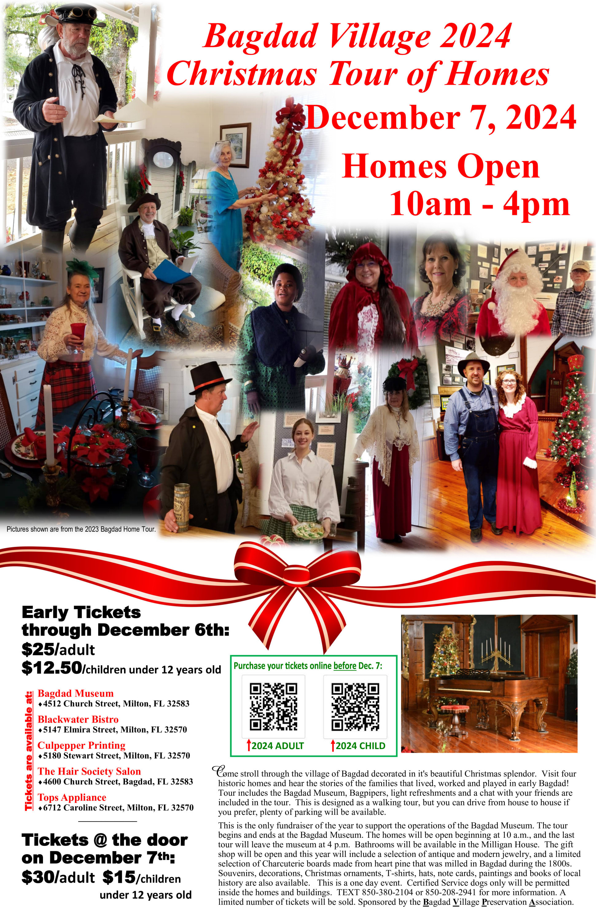 hristmas Tour tickets go on sale October 19 at the Bagdad Museum! Early Bird Special: $25 Adults $12.50 Children 12 years and younger Day of Event: $30 Adults $15 Children 12 years and younger No refunds Call 850-380-2104 for more informationAdditional Info