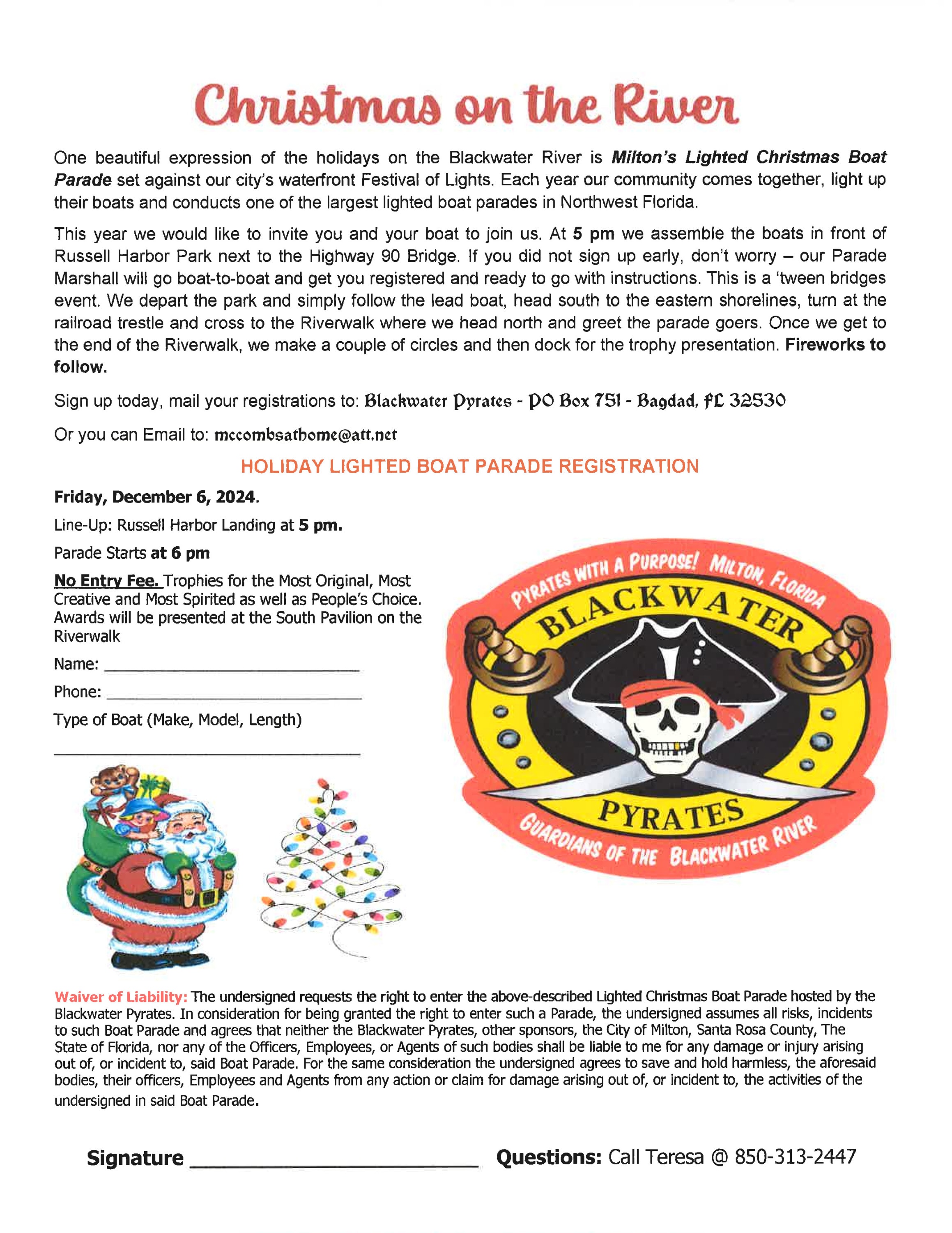 One beautiful expression of the holidays on the Blackwater River is Milton’s Lighted Christmas Boat Parade set against our city’s waterfront Festival of Lights. Each year our community comes together, light up their boats and conducts one of the largest lighted boat parades in Northwest Florida. This year we would like to invite you and your boat to join us. At 5 pm we assemble the boats in front of Russell Harbor Park next to the Highway 90 Bridge. If you did not sign up early, don’t worry — our Parade Marshall will go boat-to-boat and get you registered and ready to go with instructions. This is a ‘tween bridges event. We depart the park and simply follow the lead boat, head south to the eastern shorelines, turn at the railroad trestle and cross to the Riverwalk where we head north and greet the parade goers. Once we get to the end of the Riverwalk, we make a couple of circles and then dock for the trophy presentation. Fireworks to follow. Sign up today, mail your registrations to: Blackwater Pyrates - PO Box 751 - Bagdad, fL 32530 Or you can Email to: mecombsathome@att.net Friday, December 6, 2024. Line-Up: Russell Harbor Landing at 5 pm. Parade Starts at 6 pm No Entry Fee. Trophies for the Most Original, Most Creative and Most Spirited as well as People’s Choice. Awards will be presented at the South Pavilion on the RiverwalkAdditional Info