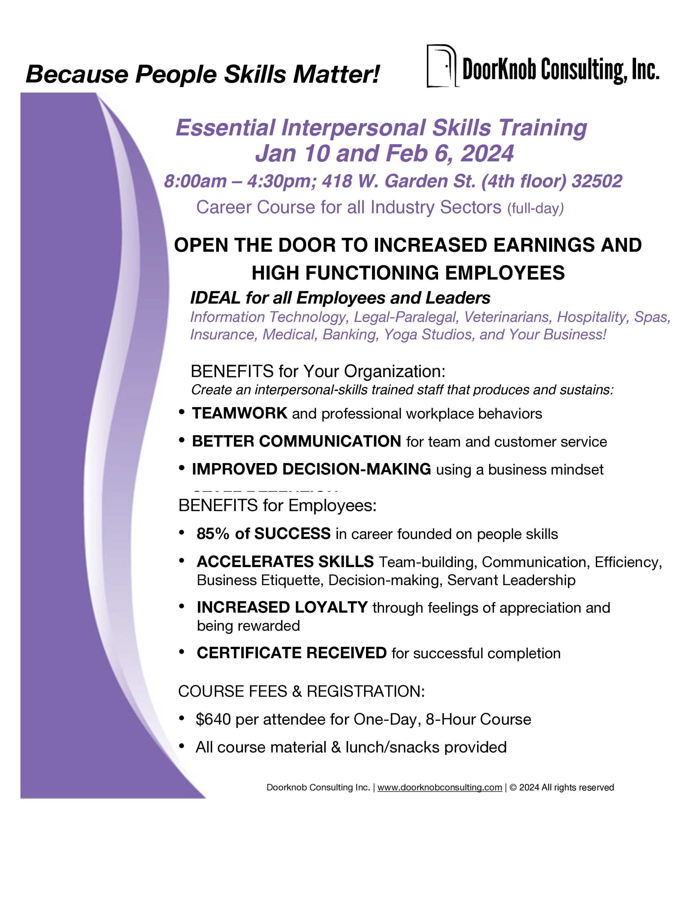 OPEN THE DOOR TO INCREASED EARNINGS AND HIGH FUNCTIONING EMPLOYEES. IDEAL for all Employees and Leaders. Information Technology, Legal-Paralegal, Veterinarians, Hospitality, Spas, Insurance, Medical, Banking, Yoga Studios, and Your Business.Additional Info